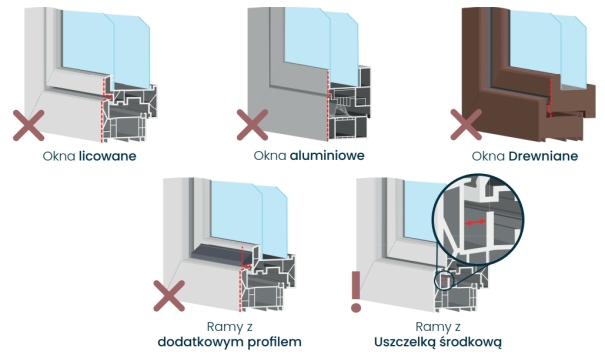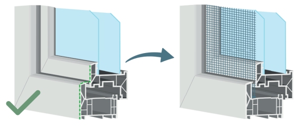 FlexScreen zazwyczaj nie pasuje bez adaptera do okien drewnianych ani aluminiowych. Dotyczy to również okien ze skrzydłem licowanym z ramą oraz okien z dodatkowym profilem na skrzydle. W przypadku ram okiennych z uszczelką środkową konieczna jest minimalna odległość 12 mm między uszczelką a ramą.
